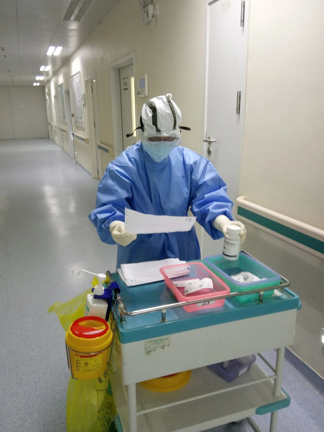 第一次进隔离病区,胡薇心里还是有些激动也有点紧张,她不断地告诉自己:胡薇加油!你一定可以的。她穿好防护服紧跟着队员们往隔离区走,走的有点急。快进门时,一位当地的护士拉住她,用武汉普通话说:“不要急,一定穿好衣服再进去。你是不是第一次进病区?”胡薇点了点头,护士又叮嘱她:“出来时,慢慢脱防护服,脏的那面朝外。加油!”透过护目镜,胡薇看到了这位护士亲切的眼神,感觉特别温暖。她想,在这里无论我们来自北京、天津还是武汉.......我们都亲如一家人,有着共同的使命。