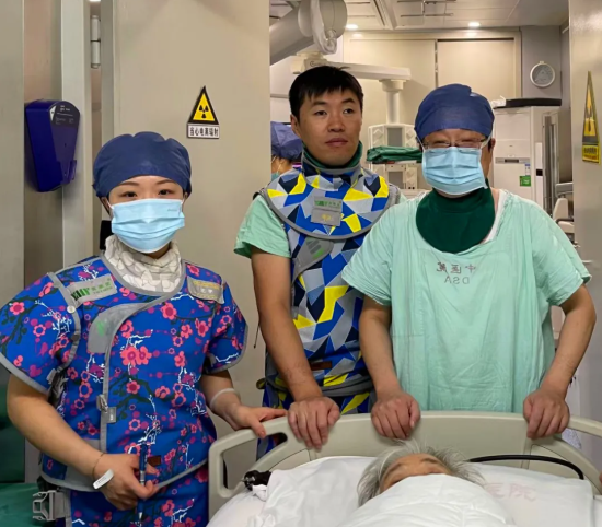 9月3日早晨,经过精心准备,患者被推进了导管室。术前心血管科团队通过充分的药物治疗改善了患者心脏功能,帮助患者耐受手术,但手术中还是遇到了多重困难。患者右侧股静脉常规入径因为动静脉重叠,影响穿刺效果,故改为左侧股静脉入径;由于患者严重的“S”型脊柱侧弯畸形,导致输送导丝和导管通过困难,就像在弯曲的窄胡同中行车,需要巧妙引导导丝和导管“急转弯”,最终在整个团队的协作下,终于经历了重重困难将起搏器输送到了指定位置;同时,高龄患者因脊柱畸形在手术床上难以坚持,给手术也增加了一定难度。但在患者的积极配合下,心血管科团队仅用不到1个小时就完成了这台超高难度手术,程控参数良好。