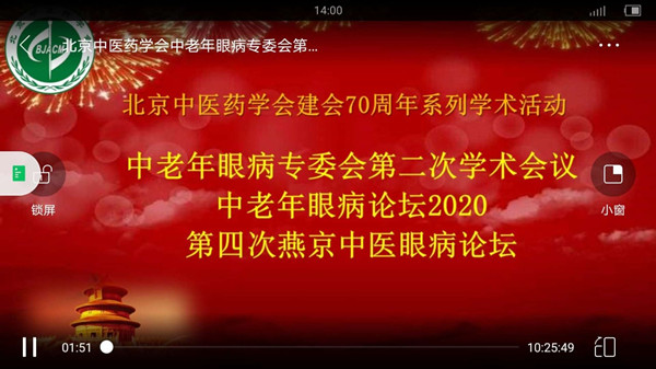 会议由我院眼科主任杨迎新主持。首先,北京中医药学会中老年眼病专业委员会主任委员冯俊汇报了专委会工作。随后,来自北京协和医院,中国中医科学院眼科医院,中国中医科学院广安门医院等多家医疗机构的专家、学者对中老年眼病的预防、治疗、康复思路、策略及中医眼科传承、特色、整合,循证进行了深入探讨。杨迎新主任作题为《基于真实世界思维探讨通络法对RVO黄斑水肿的临床观察》的报告。3000多名医护人员通过互联网平台参与了线上学术交流。