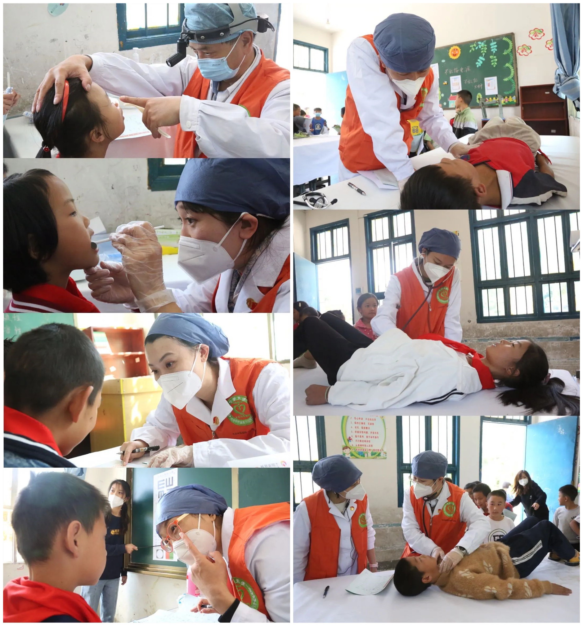 用教室搭建起的诊室虽简陋却温馨整洁,从清晨7点到傍晚5点,来自儿科、心血管科、内分泌科、骨科、皮科、营养科、耳鼻喉科、眼科、口腔科、急诊科、超声科、体检中心、肿瘤科、肛肠科、护理部等科室的21名青年医护志愿者紧张有序地忙碌着。他们中有的是割舍陪伴宝宝时间的新妈妈,有的是夜班后直奔机场的值班大夫,还有人取消了早早就与家人定好的出游计划。曾驰援过武汉的关丽说:“爱可以如此简单,付出可以如此满足。一天体检虽辛苦,这份责任却如同疫情期间我们支援武汉一样重,希望我们的付出换来孩子更加健康茁壮的成长”。