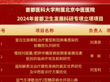近日,北京市卫健委2024年首都卫生发展科研专项项目正式立项名单公布,北京中医医院共有9个项目入选。
